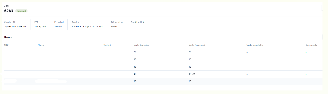 When you click into the ASN, it will show something similar to the below, the ‘Units Expected’ is what was submitted at the time of creating the ASN and ‘Units Processed’ is what the warehouse team counted when the shipment was being processed in. Any discrepancies will show a warning sign to alert you of the discrepancy.