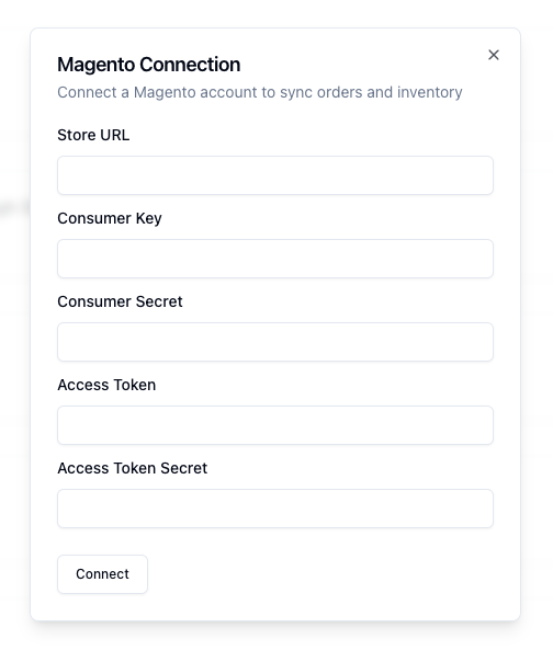 Navigate to Settings > Integrations within the Sitruna Logistics dashboard, and press Connect within the Magento section.